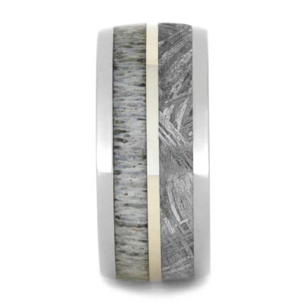 This is a beautiful deer antler ring paired with real Gibeon meteorite and accented with a white gold pinstripe. All of our deer antler wedding bands are made with only 100% naturally shed antler.