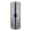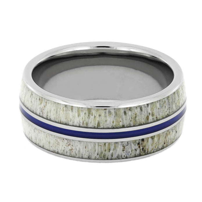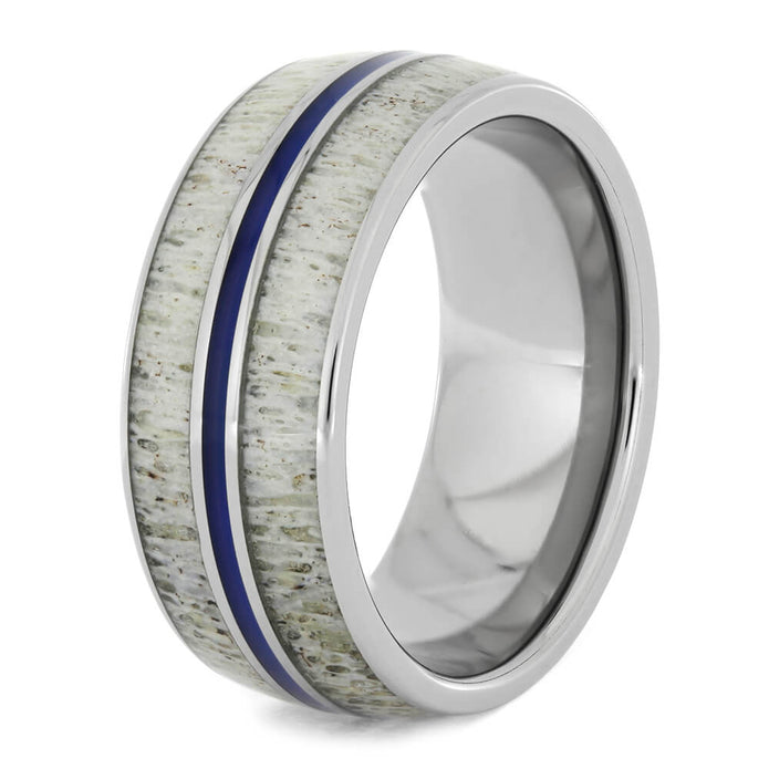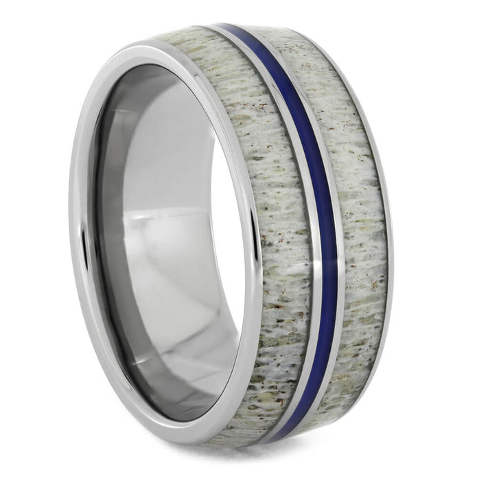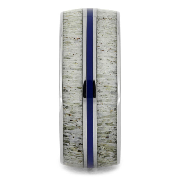 A pinstripe of blue enamel travels down the middle of this deer antler ring. Polished titanium contrasts and frames the deer antler inlays, bringing attention to their unique patterns. A deer antler wedding band is perfect for hunters or people who love the outdoors.