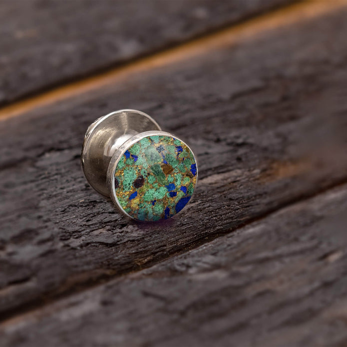 This desert mosaic tie tack is the perfect way to dress up a necktie. With its vivid blue turquoise, green malachite, and shimmering bronze, this sterling silver tie tack is sure to give your formal attire a colorful boost.