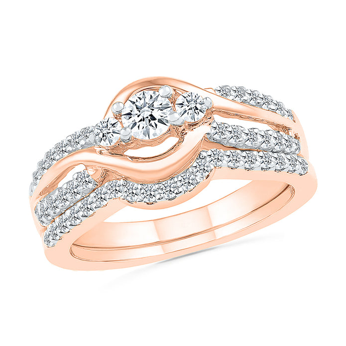 This bridal set offers 3/4 carat total weight of diamonds in a very trendy design. The diamond engagement ring features one large center stone flanked by two smaller accent stones. This gives the ring a stunning look with a ton of sparkle. The band is polished to a perfect shine that completes this wonderful diamond engagement set.