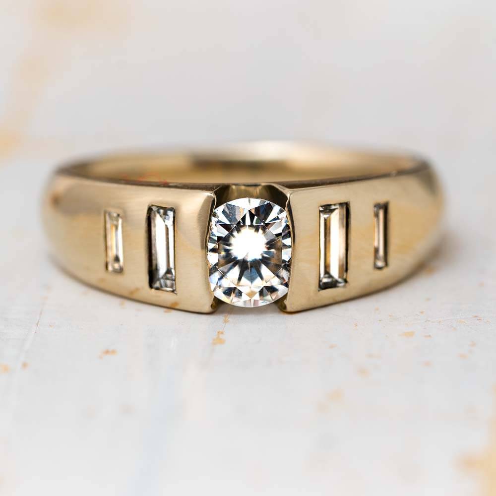 This dazzling 14k white gold moissanite and diamond engagement ring has a luster like no other. The center stone is a moissanite that will never get dull. Flanking the sides of the tension set moissanite are four baguette diamonds. A rounded gold ring holds these spectacular, white gemstones.