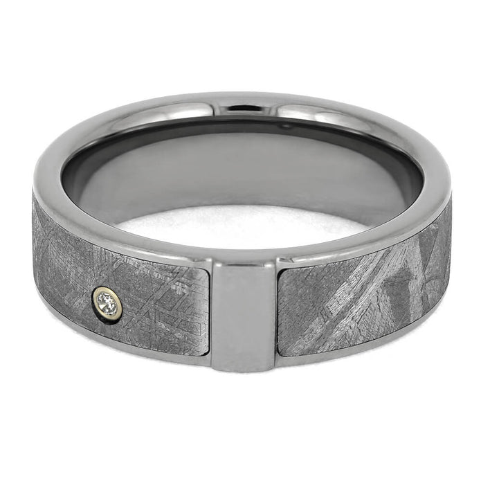 This Gibeon Meteorite ring emits a combination of strength and beauty. A bold, commanding bar of solid titanium runs perpendicular through the distinct meteorite inlay. Along with the strong statement comes an elegant solitaire diamond bezel set in 14k white gold.