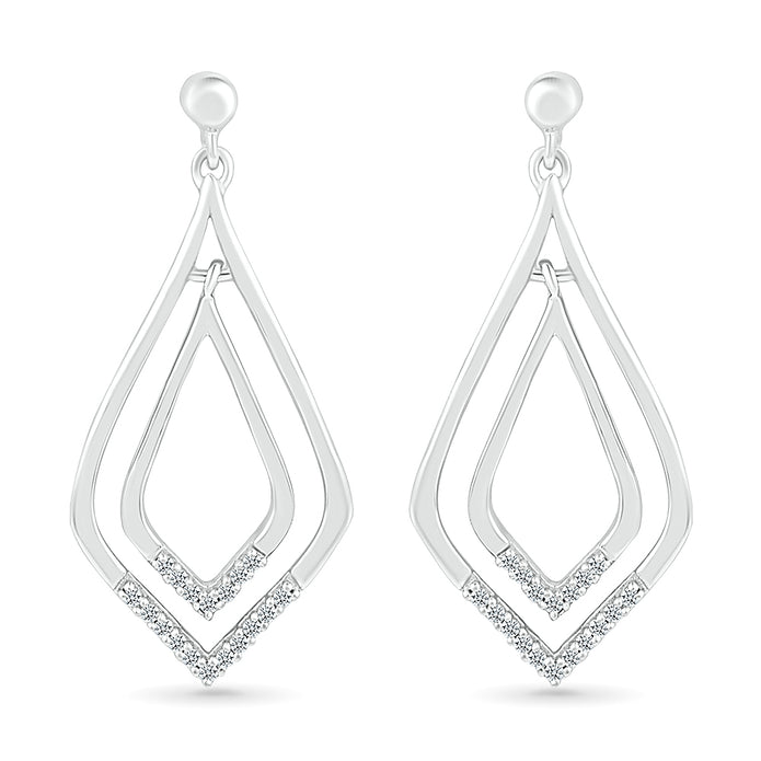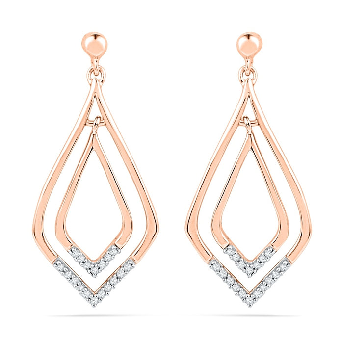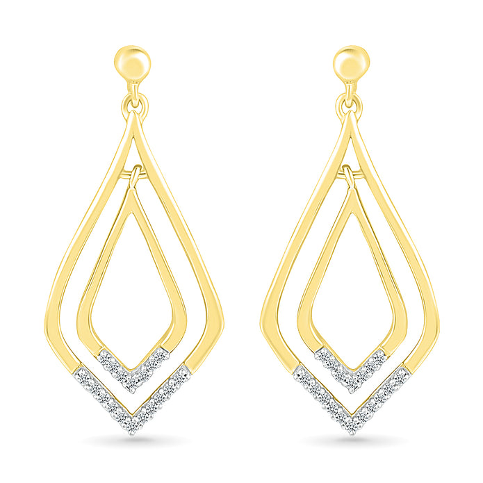 Crafted out of solid gold, these diamond earrings are a modern take on a classic diamond drop earring. With a rounded triangle or unique teardrop shape, this romantic pair of earrings features 1/10 carat TW of diamonds and are a dazzling addition to any attire.