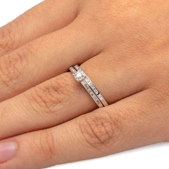 Looking for a simple yet stunning diamond wedding ring set? This dainty diamond engagement ring and diamond wedding band make quite the pair. Coordinating rings to represent your union.