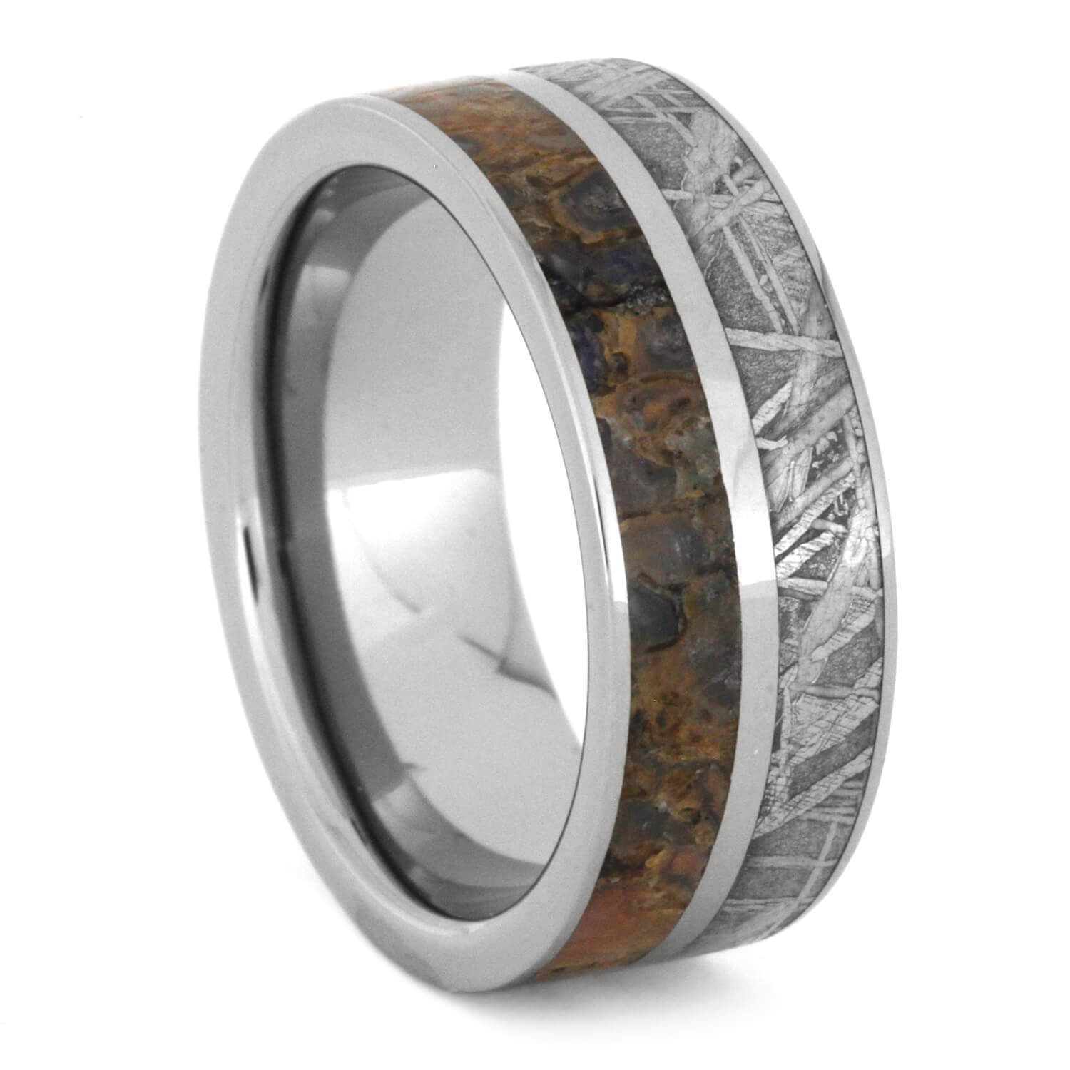 Dinosaur bone cuff links and ring set, class and style have never been more unique. Meteorite and titanium come together to accent the design. The titanium ring is inlaid with Gibeon Meteorite and dinosaur bone, separated by a titanium pinstripe.