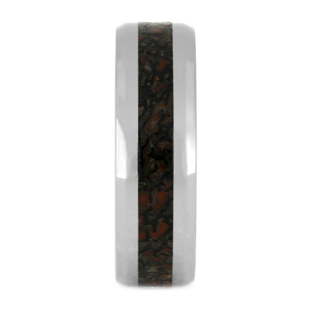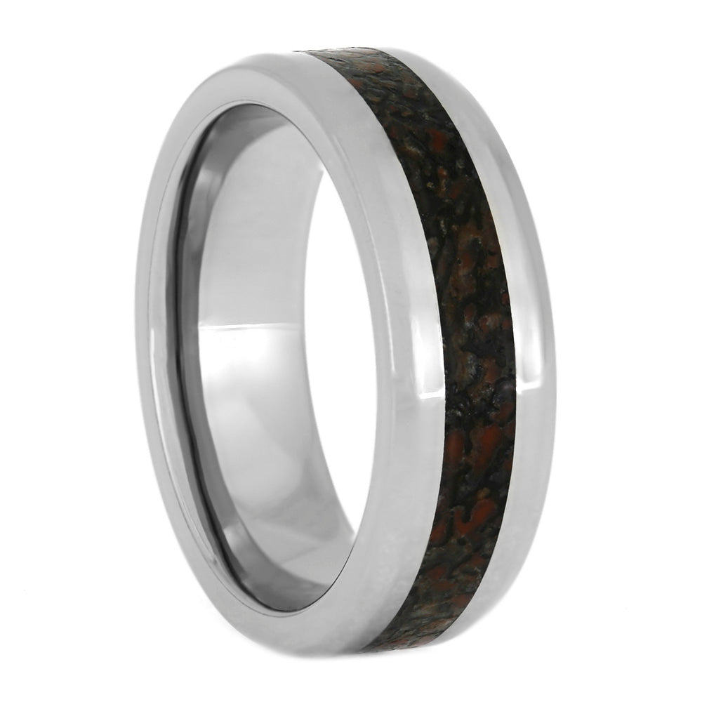 Wonderful dinosaur bone is inlaid in this beveled edge titanium ring. Wear a dinosaur bone wedding band to represent your commitment. The fossilized dinosaur bone comes in many different colors and patterns. Therefore, the color of your ring will not look exactly as pictured when you receive it.