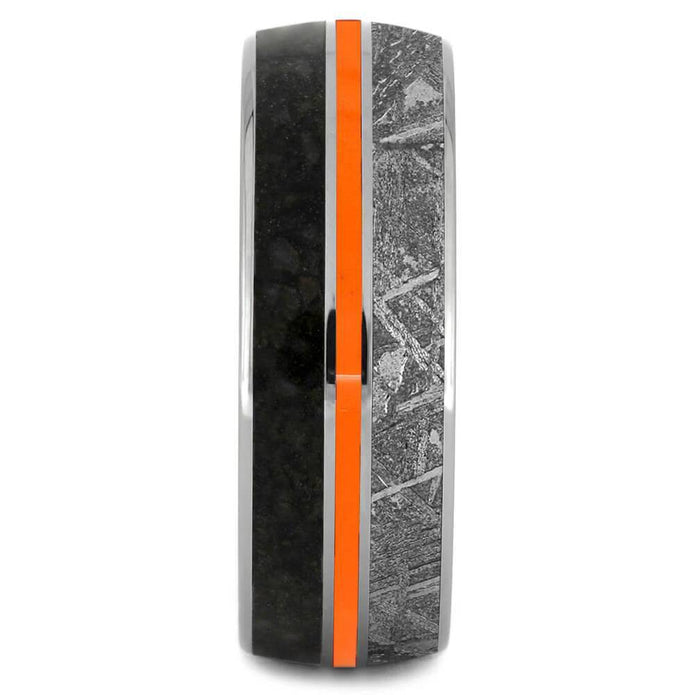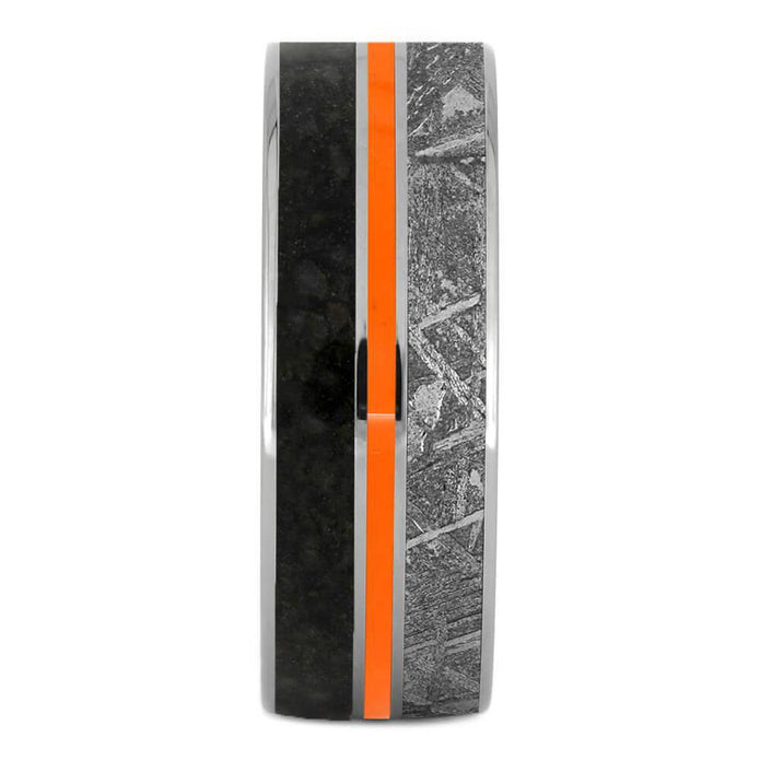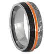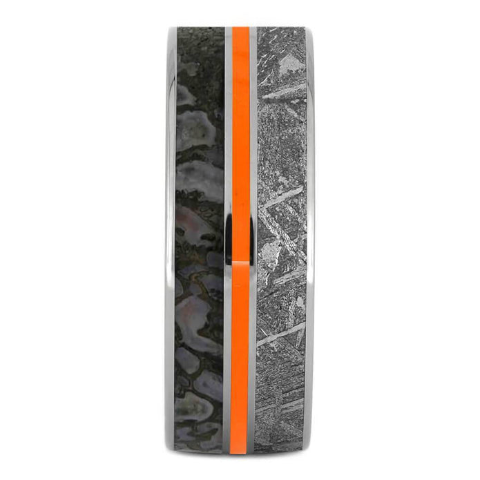 This unique men's wedding band has a blend of extraordinary materials. The sleek titanium band is inlaid with Gibeon meteorite and dinosaur bone. It also features sleek titanium pinstripes alongside an attention-getting inlay of orange enamel.