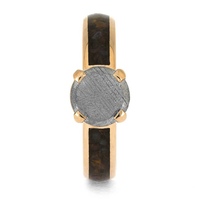 The meteorite stone featured in this 14k rose gold engagement ring breaks the mold of contemporary design. Notably, the ring's shanks are also adorned with authentic dinosaur bone, making it a truly exceptional piece. Choose this unconventional engagement ring to express your one-of-a-kind love!