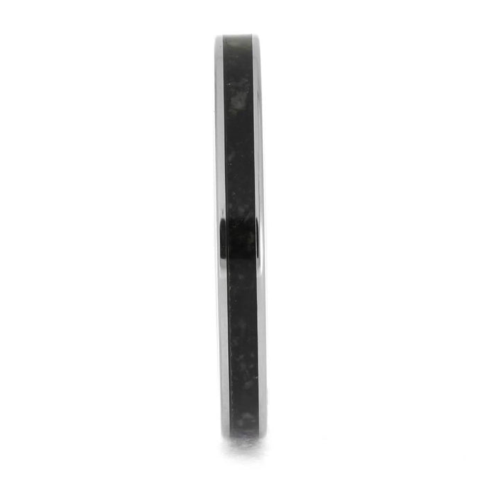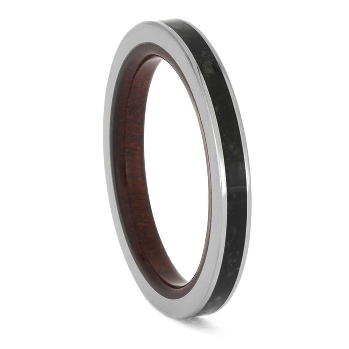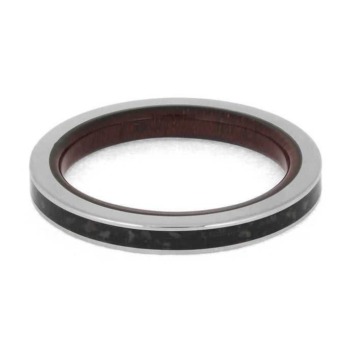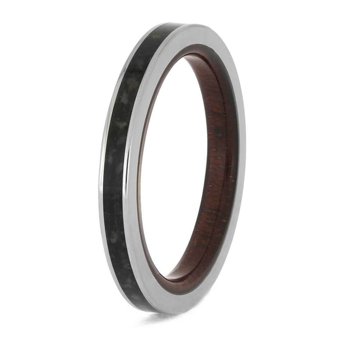 Colorful red bloodwood decorates the sleeve of this fossil wedding band for a look that's stood the test of time! The prehistoric dinosaur bone inlay is accented by polished titanium edges that highlight the fossil while protecting the inlays.