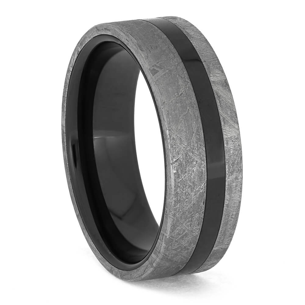 This black ceramic ring has genuine Gibeon meteorite to either side of the offset black pinstripe. It beautifully showcases the completely unique Widmanstätten pattern of the meteorite.