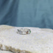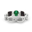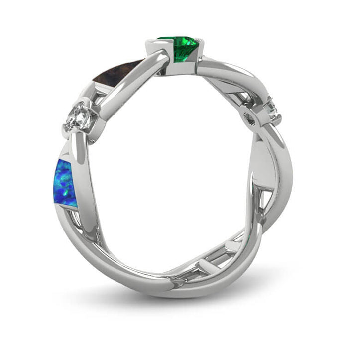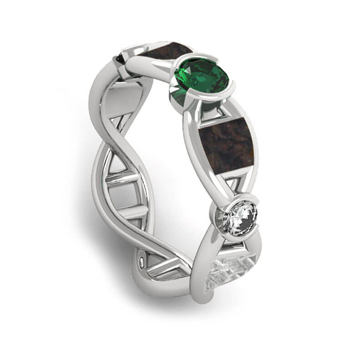 A custom gemstone engagement ring or garnet wedding ring. This 14k white gold wedding band is designed to look like a DNA structure with gemstones and unique materials accenting the band. A green tsavorite garnet sits on top of the ring with crushed dinosaur bone on each side. Following the dinosaur bone down the band are two round cut moissanites (one on each side), ending with an inlay of Gibeon meteorite and crushed synthetic opal.