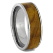 This gold box elder burl ring shows some fiery color in a titanium band. The natural wood grain and golden color makes this a perfect wood wedding band for an outdoor wedding.
