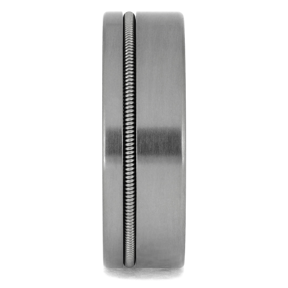This titanium ring is more than meets the eye. At first glance a sleek titanium wedding band with guitar string is seen. But underneath the surface is a marvelous mahogany wood sleeve displaying a tremendous wood grain pattern. Musicians especially appreciate this hidden layer of beauty because mahogany is commonly used for creating musical instruments such as drums and acoustic guitars, which pairs perfectly with the guitar string inlay.