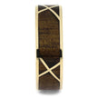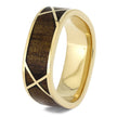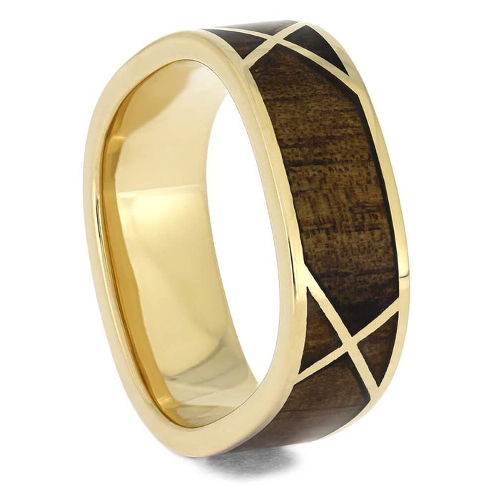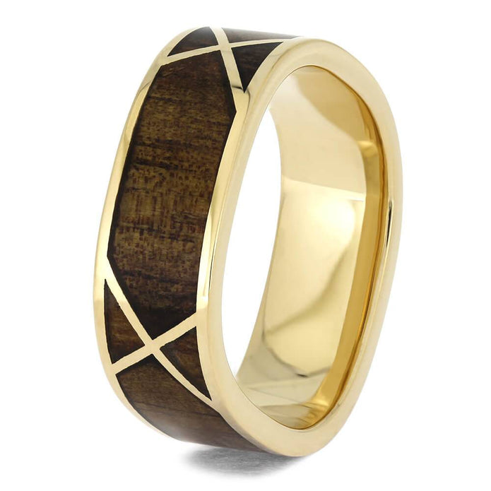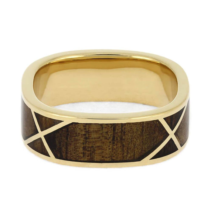 This gold wedding band has a woven pattern of crisscrossing gold over koa wood. The square profile and rugged koa wood makes this a great choice as a men's wedding band.