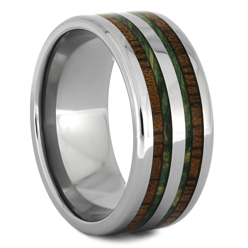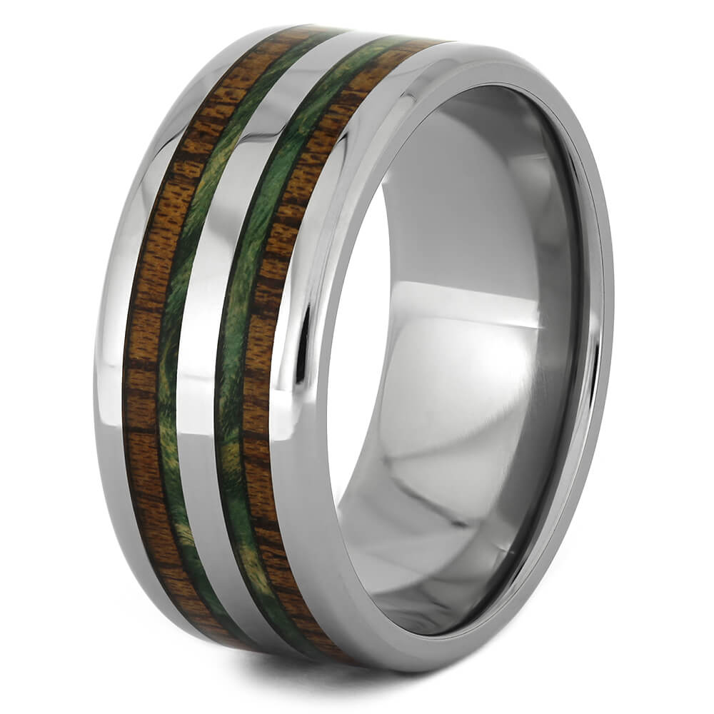This wood wedding band features two unique types of wood in a symmetrical titanium ring. Mahogany and green box elder wood burl come together in polished titanium, bringing both color and exotic style to your finger.