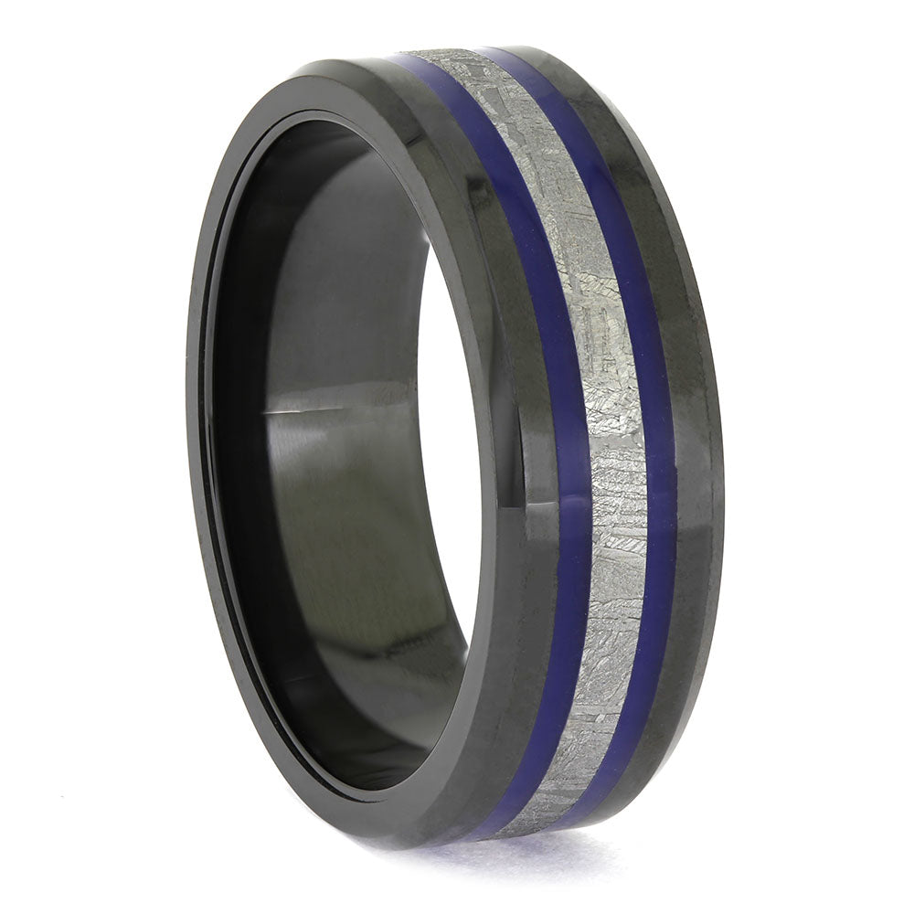 This masculine black ceramic wedding band is decorated with inlays of blue enamel and authentic Gibeon meteorite. Wear a real piece of outer space! This ring is in stock in size 12 and ships in 1-3 days.