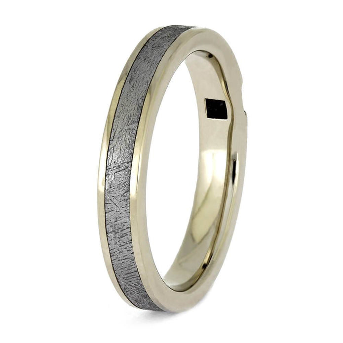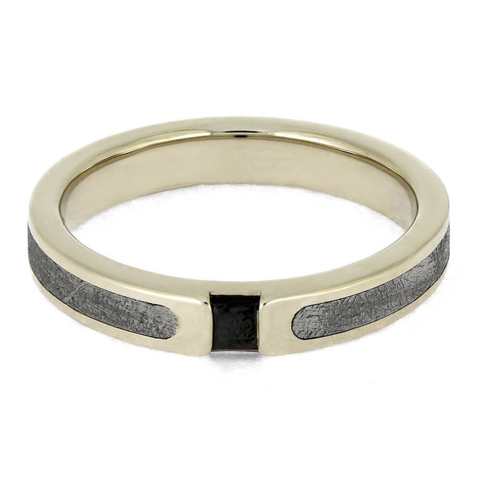 This 14k white gold wedding band or engagement ring features a striking square-cut black diamond at its center. The natural meteorite has been etched to reveal the distinct Widmanstatten patterns that wrap around the entire ring, adding a unique, space-inspired touch.