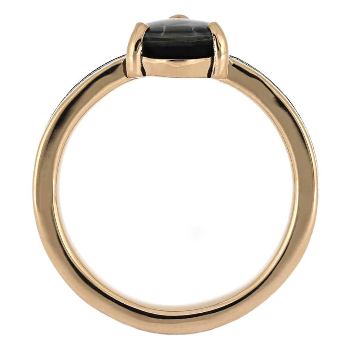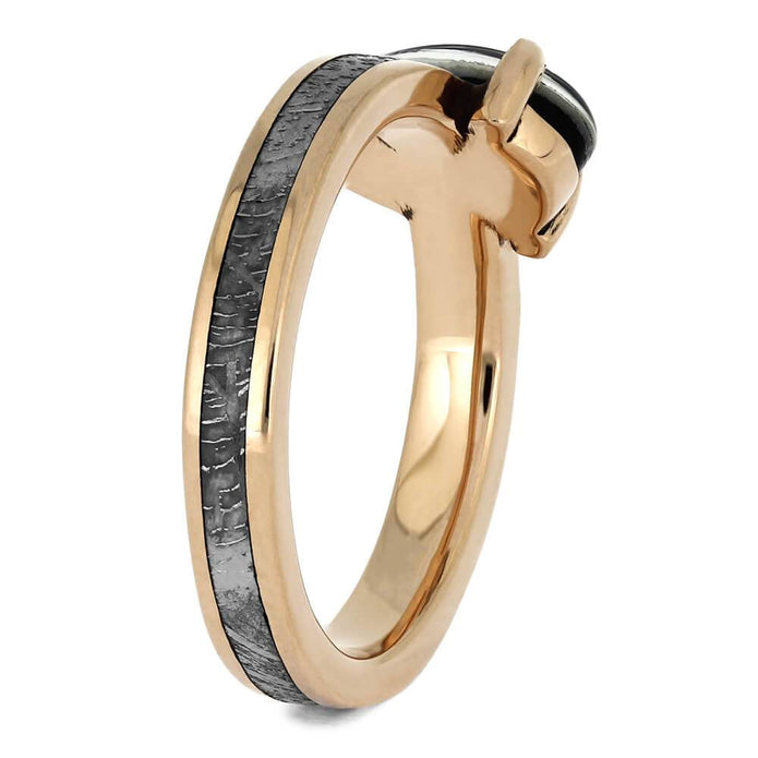 The perfectly polished 14k rose gold contrasts and embraces a beautiful pear shaped opal in this unique engagement ring. The band is decorated with genuine Gibeon meteorite, bringing a touch extraordinary to this alternative engagement ring.