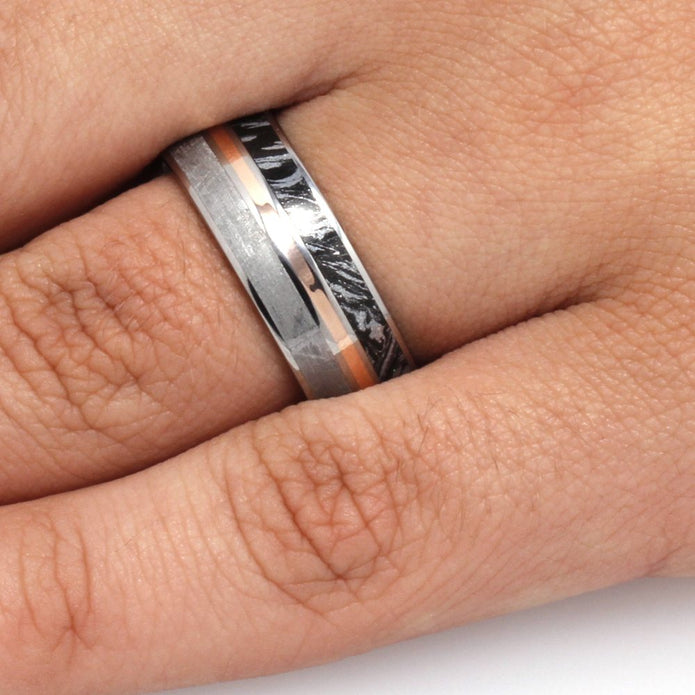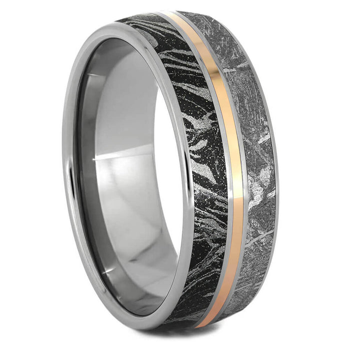 This titanium and meteorite ring shows off swirling mokume gane and bright 14k rose gold to their fullest. The three unique materials sit side by side to make this a stellar meteorite wedding band. Mokume gane translated from Japanese means “wood eye metal”. This rare metal lamination process was developed in the 17th century for the adornment of Samurai swords.