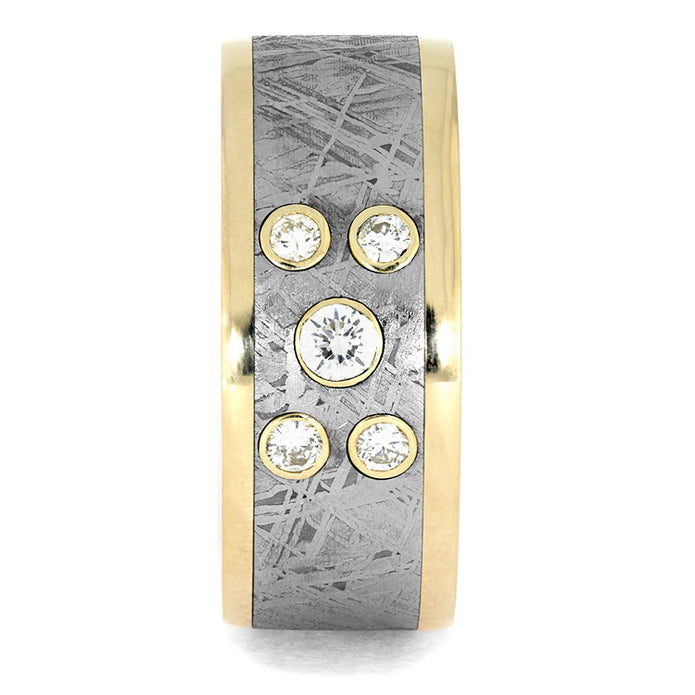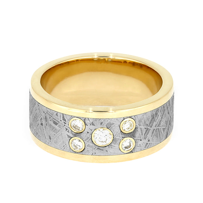 The glistening 14k yellow gold wedding band in this ring is just the beginning. With unique Gibeon meteorite as the center piece and five bezel set diamonds in the middle. The glimmering genuine diamonds are all set in yellow gold bezels, which really pulls this whole piece all together.