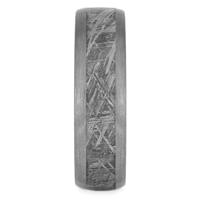 Allow us to present this spectacular Gibeon Meteorite and titanium ring with an exotic custom-made wood sleeve. This handsome ring will demand attention and will never go unnoticed. The attractive ironwood sleeve pairs beautifully with the sleek meteorite.