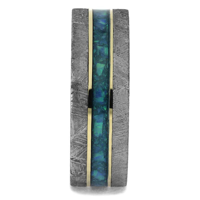 This men's wedding band features meteorite in a polished 14k yellow gold design. Colorful crushed synthetic opal decorates the middle of this unique men's ring. The meteorite edges of this wedding band bring a space theme to this unique style.