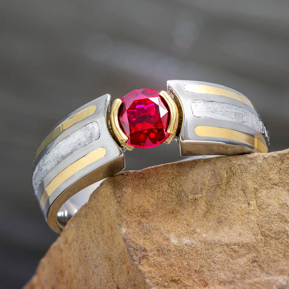 Modern Engagement Ring with Meteorite, Ruby, and Gold Pinstripes
