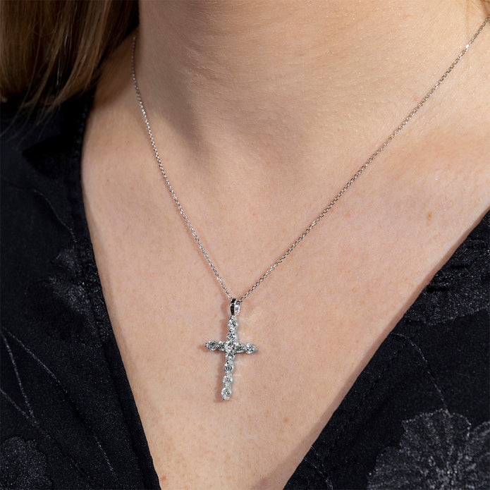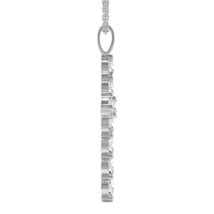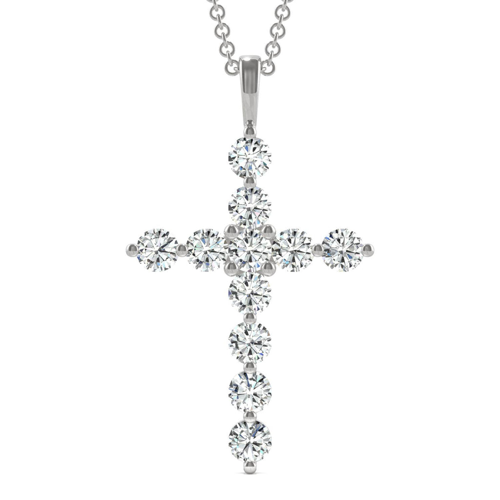 Featuring 11 moissanite by Charles & Colvard stones, this cross shaped necklace is crafted from 14k white gold.