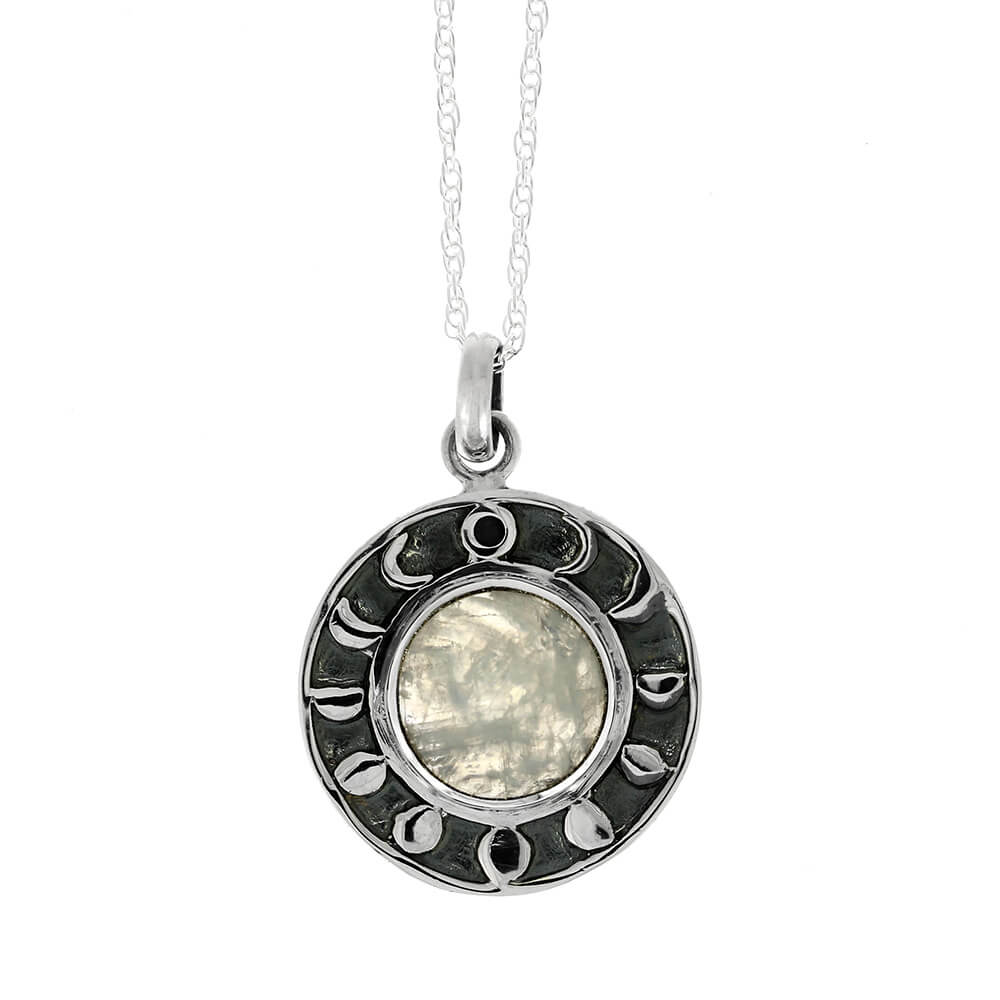 Celebrate the celestial with this moonstone moon phase necklace! This unique rainbow moonstone necklace presents the June birthstone in a sterling silver pendant featuring the phases of the moon around the bezel-set gemstone.