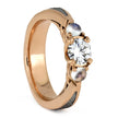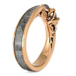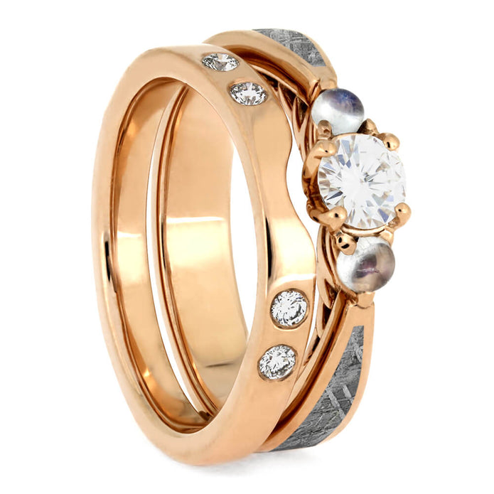 Colorful moonstones and genuine meteorite adorns this handmade 14k rose gold bridal set. Twin moonstones add an extra touch of beauty, while a matching shadow band hugs the curves of the engagement ring. Share your love with these rose gold rings!