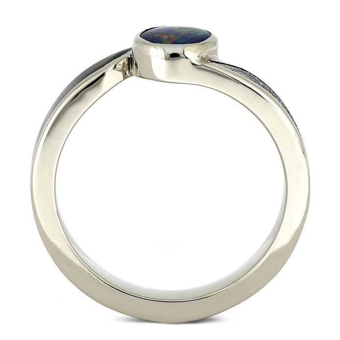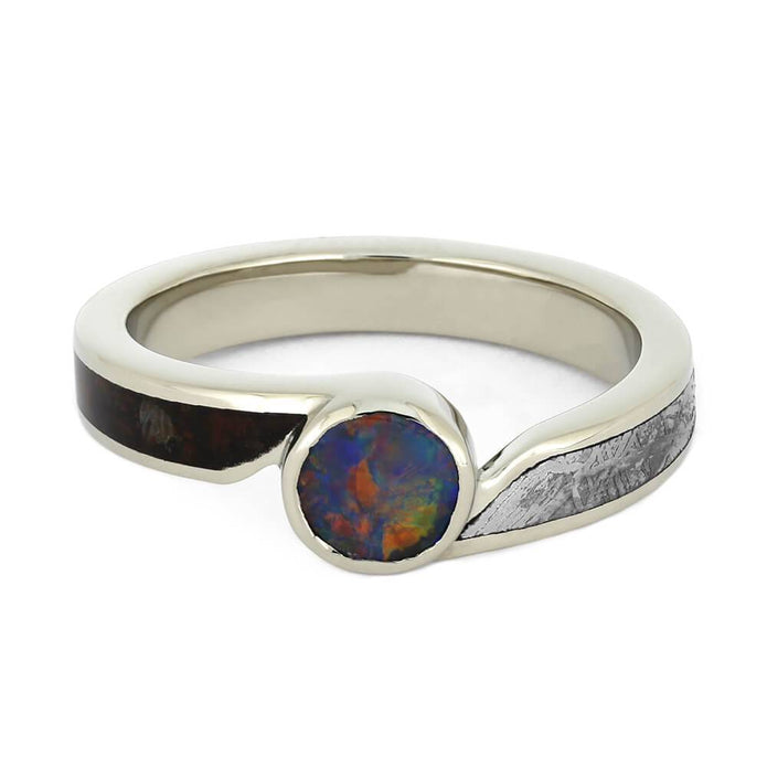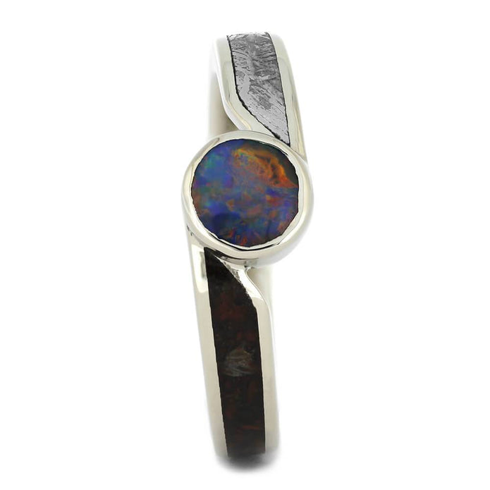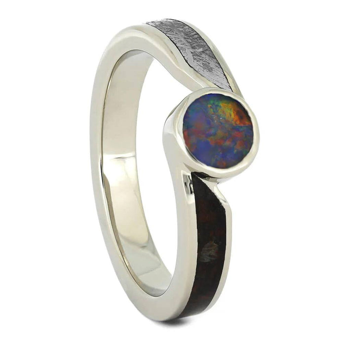This amazing, black opal engagement ring is unlike any other. In addition to its colorful, featured stone, the ring is inlaid with both authentic Gibeon meteorite and fossilized dinosaur bone.