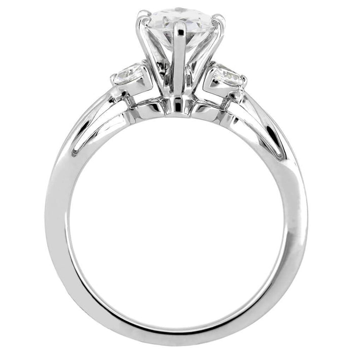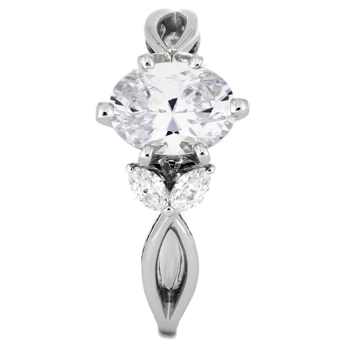 This white gold engagement ring features a gorgeous, oval cut diamond in a 6-prong setting. This ring's shank features marquise cut diamond "leaves" and a cathedral profile. A solitaire engagement ring that boasts endless sparkle and a vintage style inspired by nature.