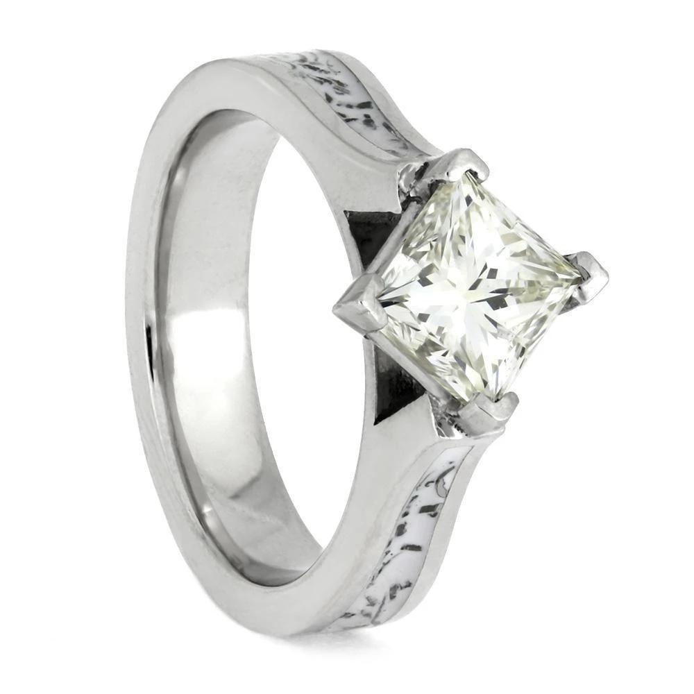 An elegant square-cut moissanite glistens atop this handmade engagement ring. The luxurious platinum shank is decorated with white Stardust™, which contains real Gibeon meteorite. This platinum solitaire is perfect for space enthusiasts!