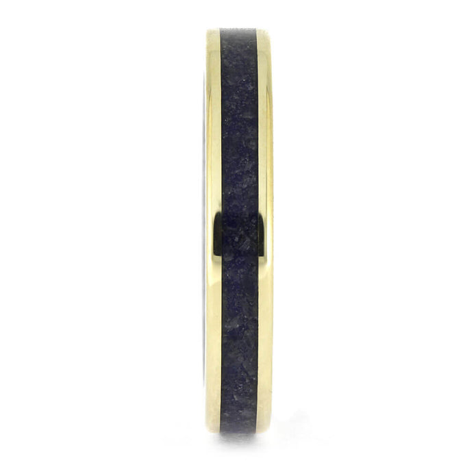 Mark your birth month with elegance through this handcrafted birthstone wedding band. Its sleek polished finish is highlighted by dazzling sapphire fragments, making each piece uniquely captivating. Showcase your love for nature with this distinctive ring, handcrafted in the USA.