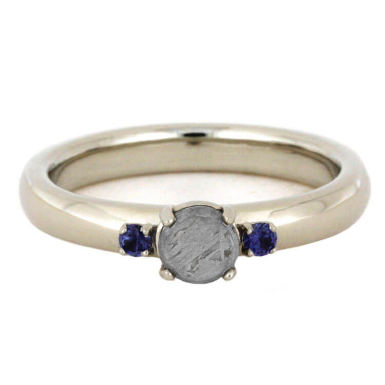 Introducing one of my personalized, three stone meteorite engagement ring. This 14k white gold ring has a center meteorite stone and is accented with blue sapphires.