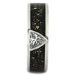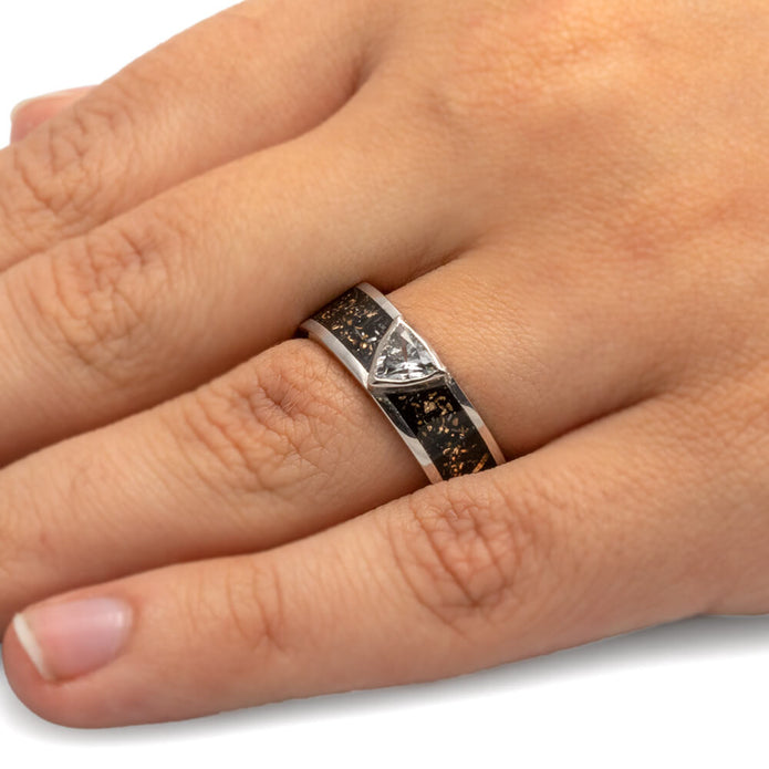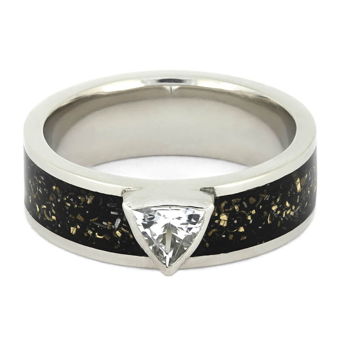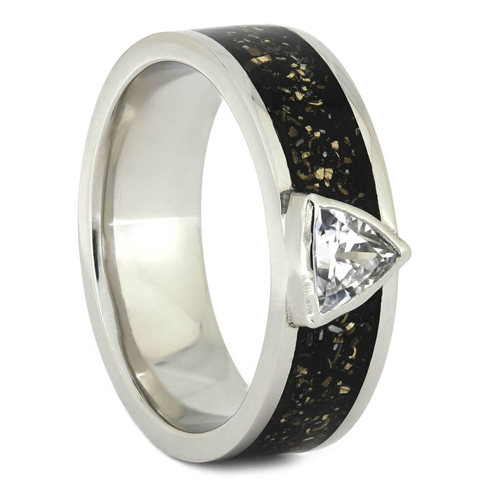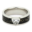 This alternative engagement ring features black stardust with gold flakes, simulating a starry night sky. The center stone has a unique trillion cut and is set in a polished platinum bezel. Be the star of your own show with this meteorite wedding ring!