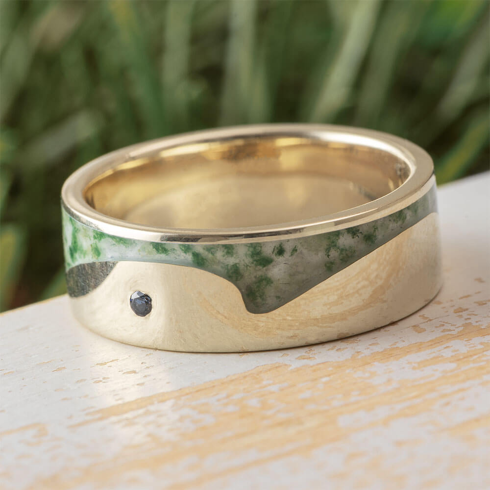 Celebrate your love with this stunning Moss Agate Wedding Band, a masterpiece of nature and craftsmanship. The wavy inlay of crushed moss agate, set in lustrous 14k white gold, creates a mesmerizing organic pattern that symbolizes growth and eternal connection. Each band is expertly handcrafted to showcase the unique variations in the moss agate, ensuring no two rings are exactly alike.