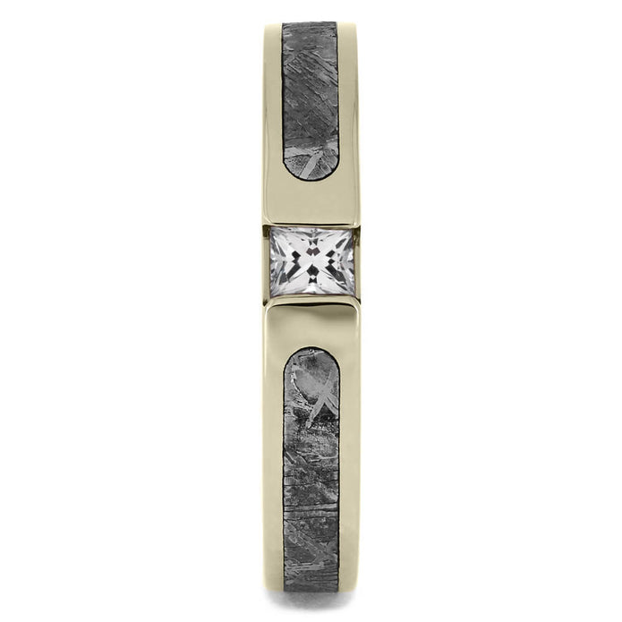An eye-catching square cut Moissanite shines at the center of this 14k White Gold Engagement Ring. The solid, natural meteorite has been etched to reveal the characteristic patterns, or Widmanstatten figures, wrapping all the way around.