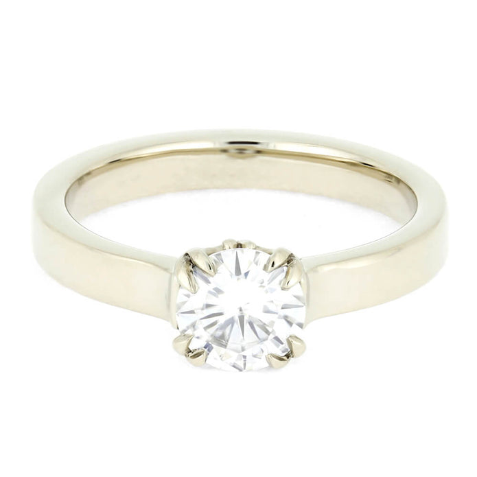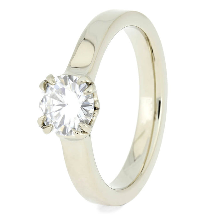 The moissanite in this 14k white gold engagement ring has a unique antler prong setting. The solid white gold pairs well with the bright moissanite stone in this timeless, solitaire engagement ring with a unique design.