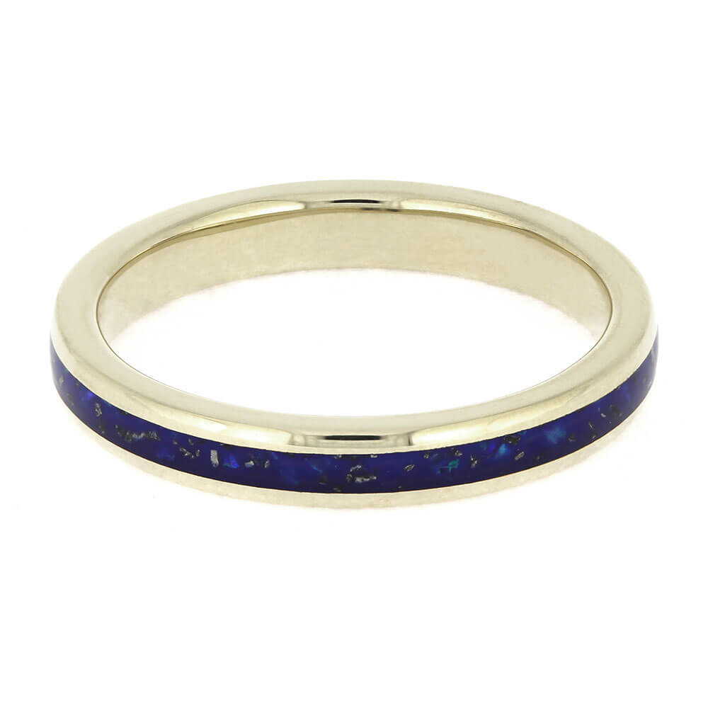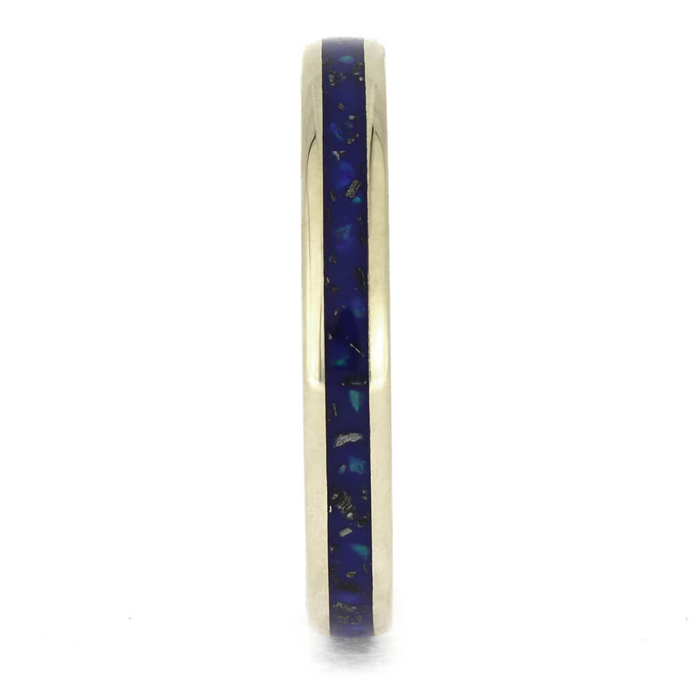 Crafted from 14k white gold with a smooth finish, this wedding ring for women combines classic and contemporary elements, making it a perfect choice for your special day. Adorned with blue Stardust meteorite shavings and synthetic opal accents, this 3mm ring offers a vibrant and unique appearance that will truly stand out. Make a big splash with this sophisticated and modern twist on a timeless design.