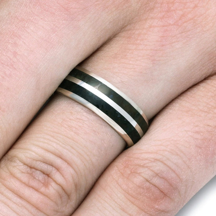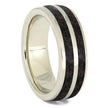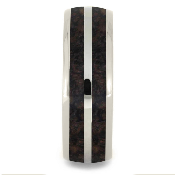 Here is a classic men’s wedding band with an extraordinary element that has stood the test of time. Inlaid in the smooth white gold are two genuine dinosaur bone inlays. Crushed dinosaur bone is coated with our Ring Armor protection making it durable and water-resistant.